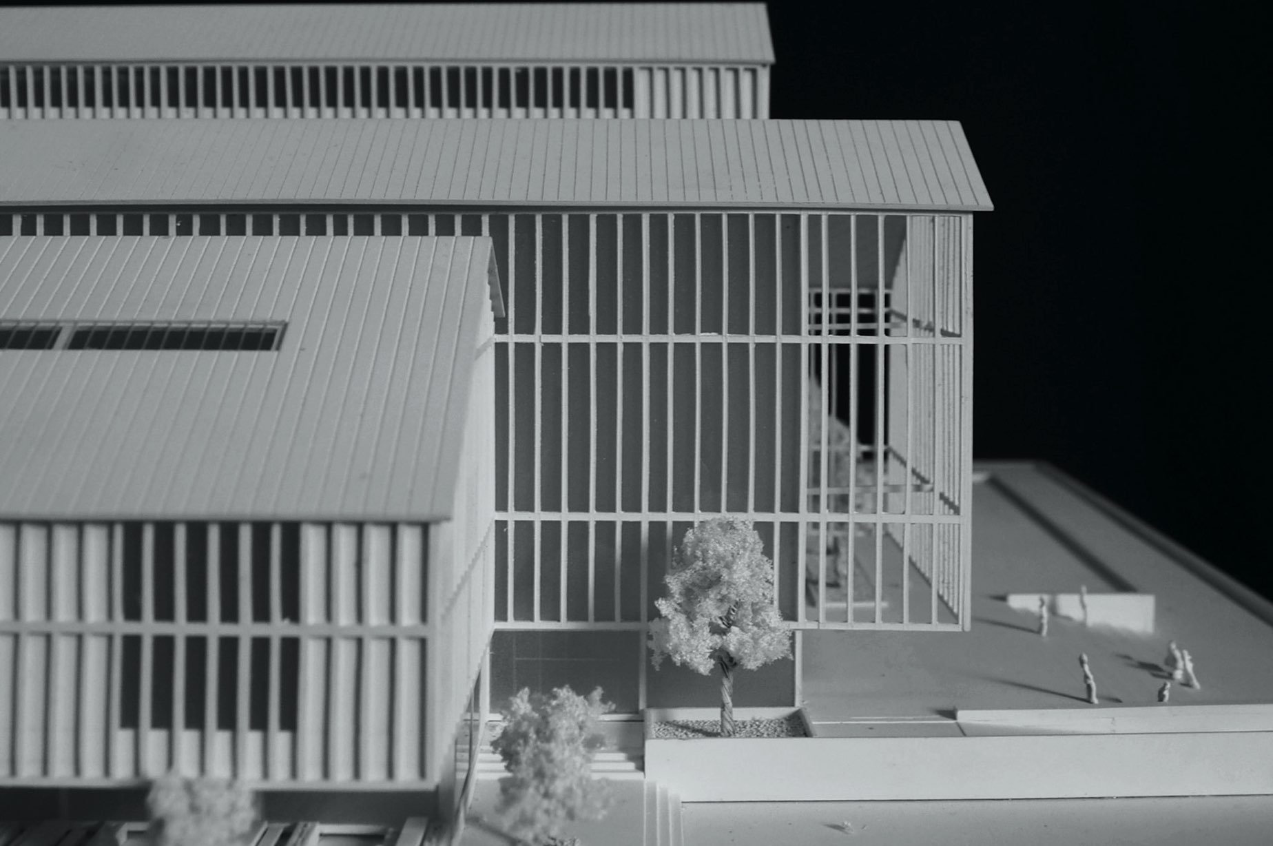 The façade is clad with GRC panels and fins painted in brownish terracotta color to match the surrounding familiar clay roof tiles. Reflecting the interior space, the middle box as the lobby are the most porous one with extended awning and vertical louvres on both North and South part.